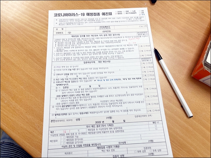 병원에 도착을 하시면 예방접종 예진표를 받아 적어야 하는데요 꼼꼼히 읽어보시고 작성을 해야 합니다 작성을 끝마쳤다면 잠시 대기했다가 본인 이름을 호명하시면 의사 선생님이 직접 3차백신 접종을 해주십니다