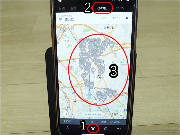 지금은 코로나 바이러스에 대한 대책이 잘 마련되어서 백신 당일 예약도 수월해졌는데요 누구나 카카오톡은 다 있으시죠? 카카오톡 앱을 실행시키면 위 사진처럼 눈 모양 1번이라고 표시를 해두었습니다 터치해주시면 상단에 2번이라고 체크해둔 잔여백신을 누르시면 본인 주변 잔여백신이 접종 정보가 뜹니다