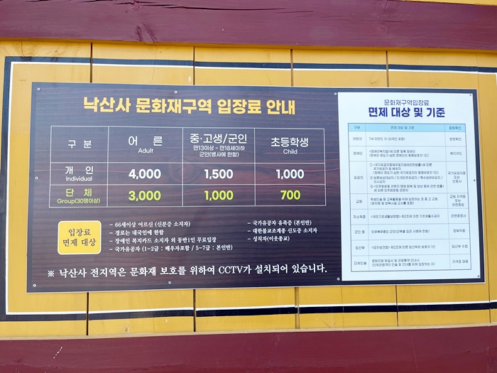언제부턴가 낙산사 문화재 보호 차원에서 입장하실 때 입장료를 결제를 해야 하는데요 예전 낙산사 화재가 나기 전에는 그냥 개방했던 걸로 기억이 나는 것 같습니다 어떤 이유였는지 문화재가 화재로 인해 소실이 되었지만 현재는 복구를 완료한 상태입니다 절벽에 절이 있어서 유명해진 낙산사 소원 성취도 잘된다는 곳이기도 하는데요 이번에는 낙산사 입장료와 입장료 면제 대상도 알아보도록 하겠습니다