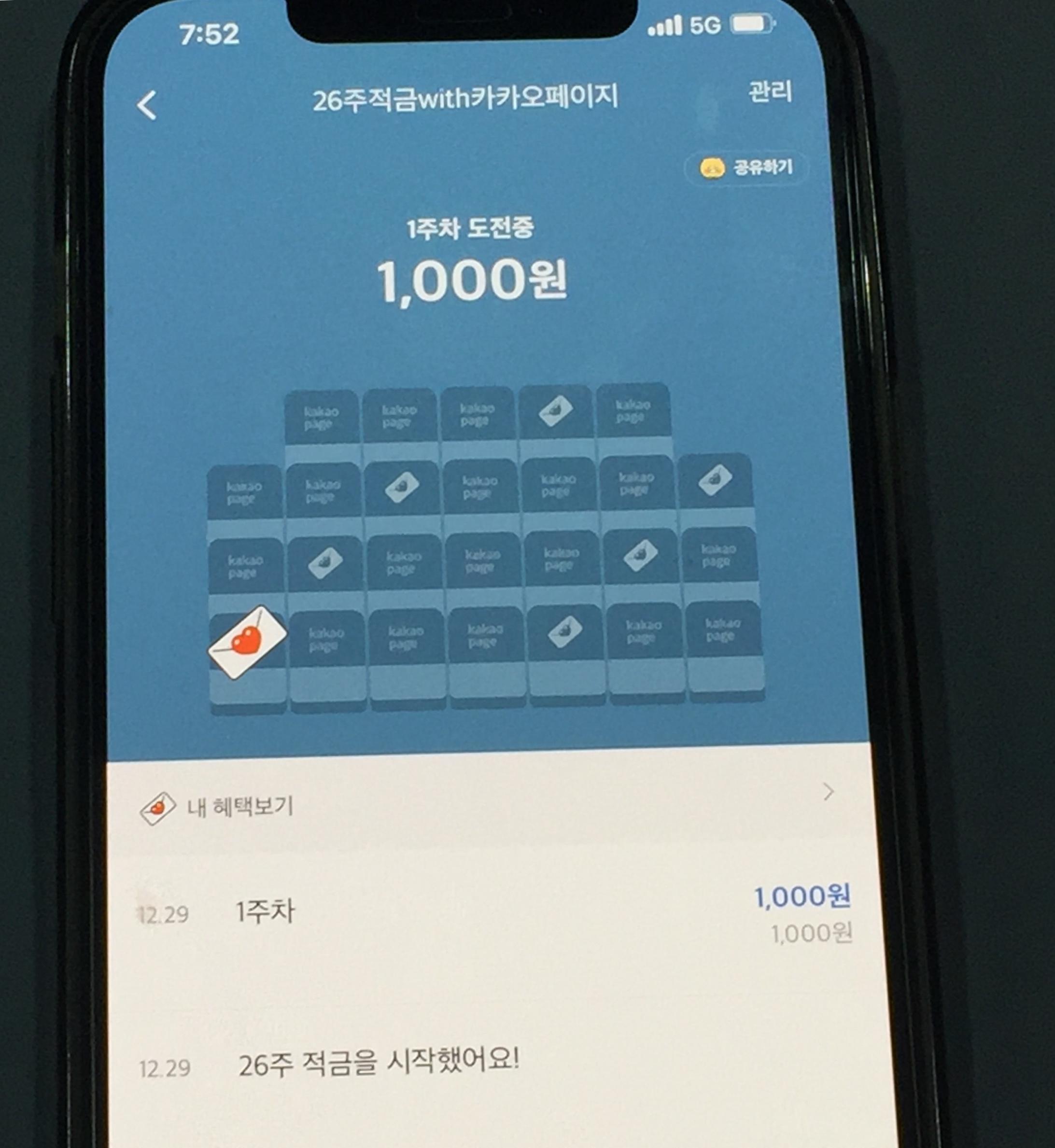 카카오 26주 동안 가입날짜에 계약이 이루어져 1주일마다 한 번씩 적금을 드는 방식입니다.