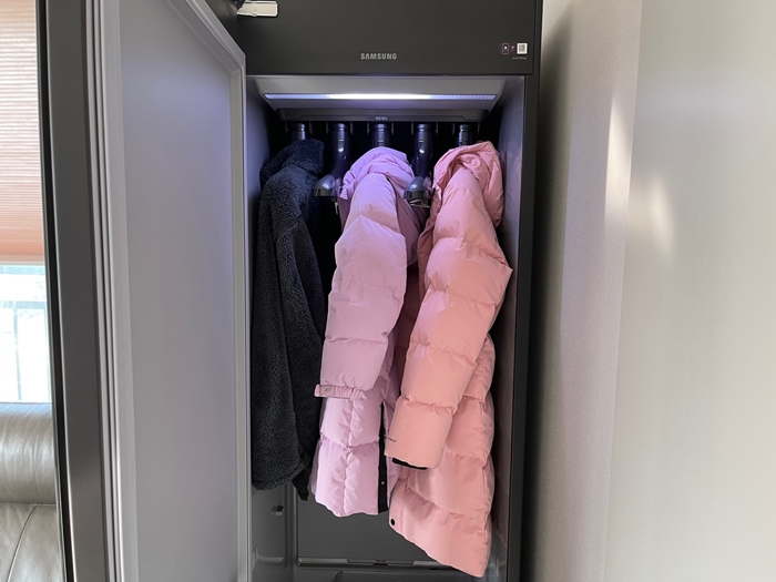 겨울철이라 외투 부피가 상당한데요 삼성 에어 드레서 5벌짜리이지만 5벌을 모두 넣으면 제트에어 기능이 제대로 발휘를 못할 듯싶습니다 중간에 먼지가 털어져야 할 여유가 있어야겠죠