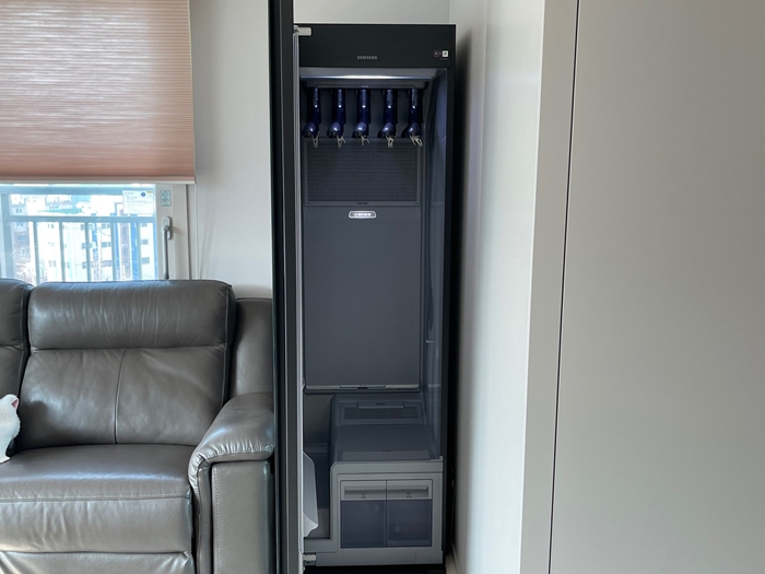 삼성 비스포크 에어드레서 대용량을 쓰고 있는데 총 5벌을 구비할 수 있습니다 삼성제품 중 3벌짜리도 있지만 아무래도 겨울철 외투를 하려면 어려운 부분이 있지 않을까 라는 생각이 듭니다 겨울철에 코트나 외투 등 5벌을 모두 걸어 제트에어를 쏘게 되면 바람이 통과할 틈이 없기 때문에 대용량이 좋을 듯합니다