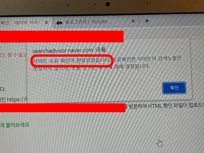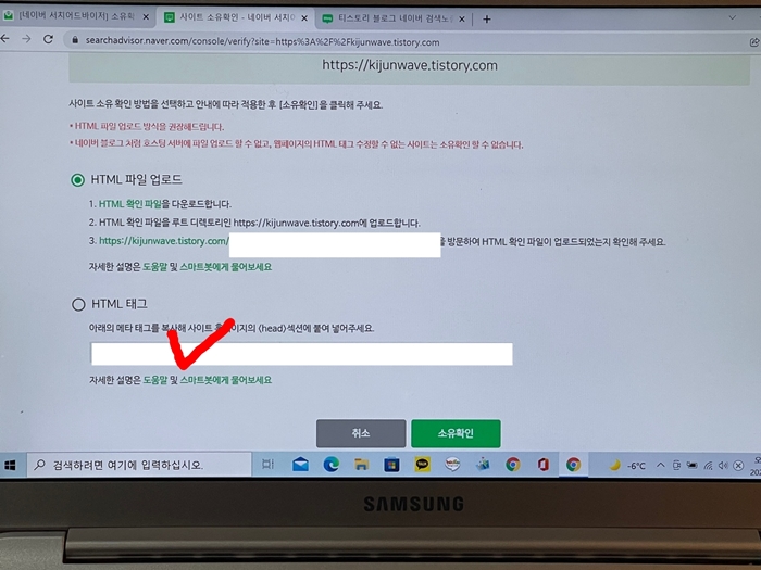 티스토리에서 메타 등록을 끝내셨다면 다시 네이버 웹마스터 도구 오셔서 소유확인을 눌러주세요