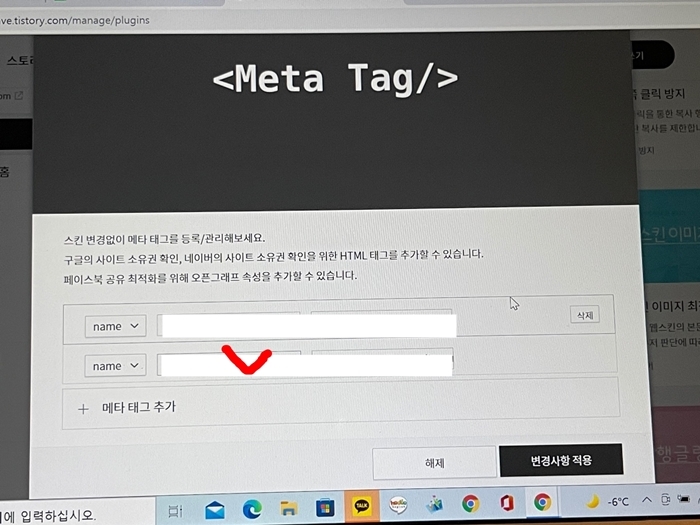 메타 태그 추가라는 빈곳에 네이버에서 복사한 메타 태그를 붙여 넣기 해주시면 됩니다 꼭 변경사항 적용 눌러주셔야 검색엔진 최적화가 될 수 있습니다