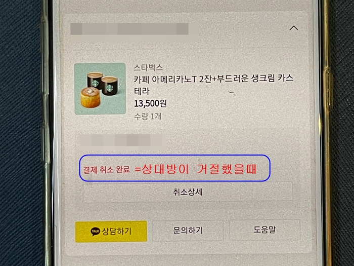 '구매 결정 사용 완료'는 선물을 받았다는 뜻이며 '결제 취소 완료'는 상대방이 선물을 거절했을 때 나타나는 문구입니다