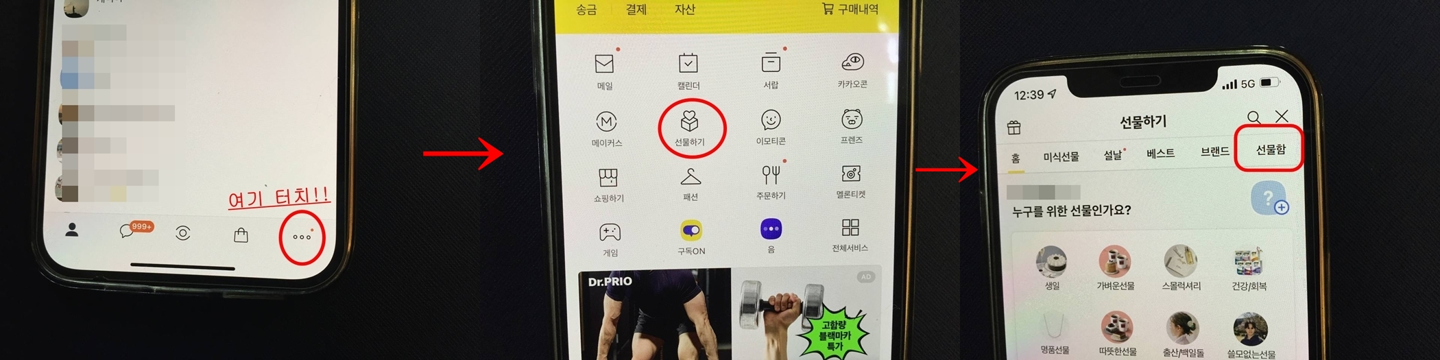 위 사진을 보시면 카카오톡을 눌러주세요 오른쪽 하단에 점점점 표시해 두었습니다 선물하기와 선물함을 차례대로 터치