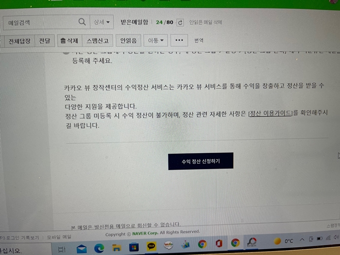카카오뷰 수익 정산 페이지는 PC로만 가능하고 모바일은 신청이 불가능하게 되어 있더군요 본 메일란에 수익 정산 신청하기 누르고