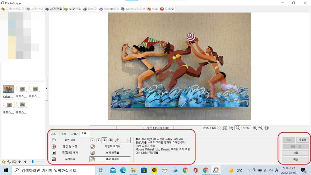 사진 편집 기능에는 도구라는 곳이 있어요 인물 사진에서 피부를 매끈하게 만드는 잡티제거 기능과 빨간 눈 보정 기능이 있는데 pc에서 메이크업 보정기능이 있습니다